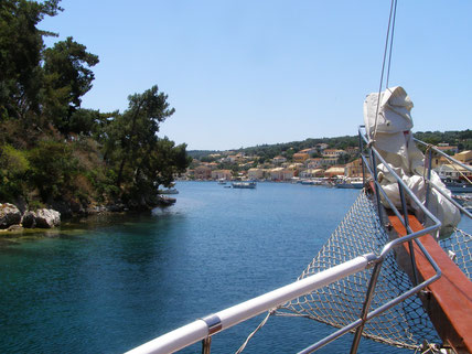Aankomst bij het eiland Paxos. Met de boot "Captain Hook" vanuit Parga naar de eilanden Paxos en Anti Paxos (onbewoond). Doen!! Misschien zelfs dolfijnen onderweg.